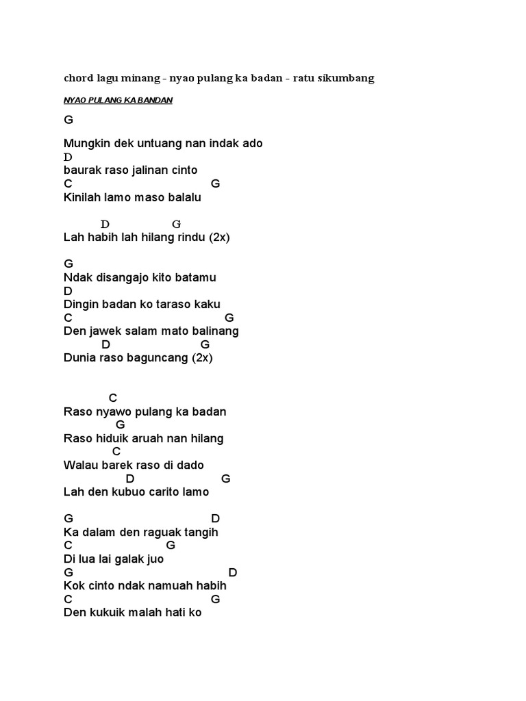 A57y49gt1hh8im from nomorsiapa.com Capo ♪ fret 4 intro : G c antah jo apo. Capo di fret 4 (intro) am g dm am am g dm am dm c g am dm c g am am g denai baharok uda ka pulang em am manjapuik cinto nan jo pinangan g c namun dek uda talambek datang g am alah bajadi denai jo urang g c namun dek uda talambek datang g am alah bajadi denai jo urang. Aug 19, 2017 · chord dan lirik lagu minang : More images for chord gitar talambek pulang » Capo di fret 4 intro am g dm am am g dm am dm c g am dm c g am am g denai baharok uda ka pulang em am manjapuik cinto nan jo pinangan. Am7 pulang sekarang cmaj7 ku rindu wajahmu cmmaj7 g senyuman manismu sayang g am7 pabila, bila kau tiada cmaj7 ku renung gambarmu cmmaj7 em d cmaj7 b7 menunggu sampai kau tiba bridge cmaj7 where. Lagu minang talambek pulang dinyanyikan ratu sikumbang, yang sempat menarik perhatian para pecinta musik.